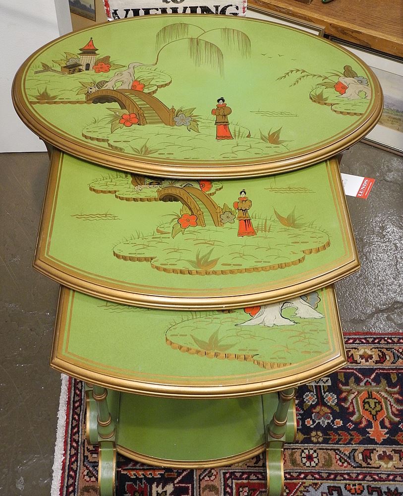 LOT 348 Trio of Green Chinoiserie Nesting Tables, 24"h. Estimate: $120 - $180 Sold For: $130 Auction Date: Tuesday, November 18 2025 at 4:00 PM