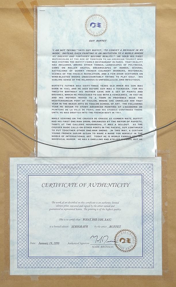 LOT 193 Serigraph signed G.(Guy) Buffet, 16 3/8 x 13", "What Did You Say" #181/500. Estimate: $60 - $100 Auction Date: Tuesday, November 18 2025 at 4:00 PM