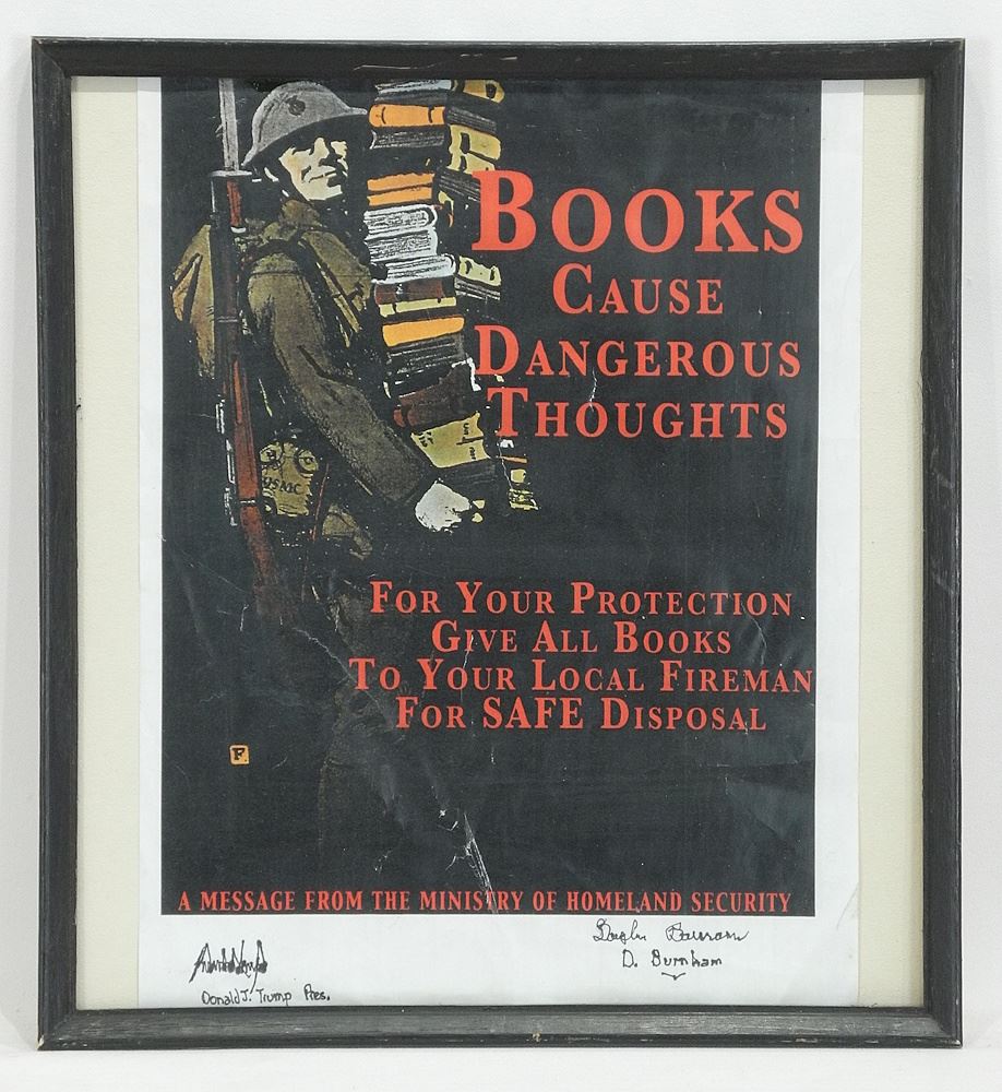 LOT 6 Regressive US Nationalist Poster, "Books Cause Dangerous Thoughts", 14 x 12 3/4". Estimate: $50 - $60 Sold For: $100 Auction Date: Tuesday, November 18 2025 at 4:00 PM