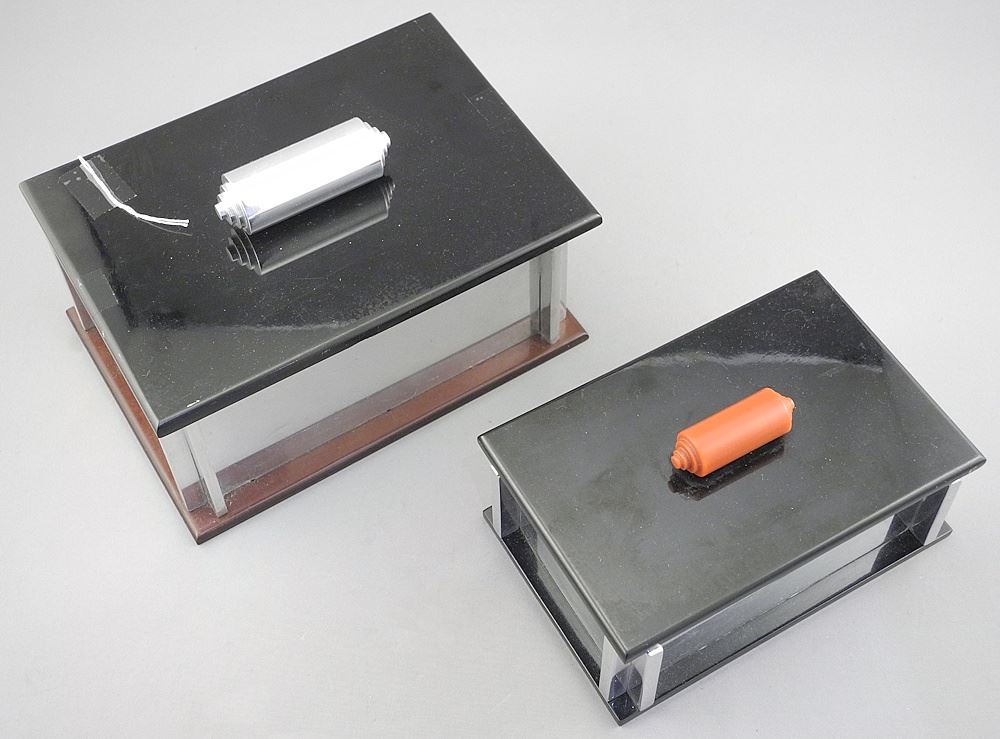 Two Art Deco Celluloid & Aluminum Cigarette & Cigar Boxes, 6 1/4 x 7 1/2" (as found).