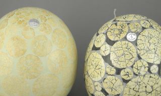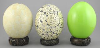 Four Egg Shaped Objects: D. Mitchell /Avoova/Green with 3 Stands, 3 1/4 - 6 1/2"h.
