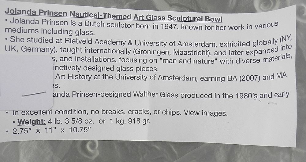 LOT 120 Sculptural Art Glass Bowl by Jolanda Prinsen, 2 3/4 x 11 x 10 3/4". Estimate: $50 - $100 Sold For: $40 Auction Date: Tuesday, January 27 2026 at 4:00 PM