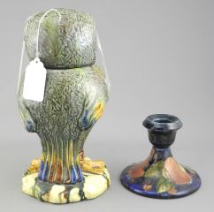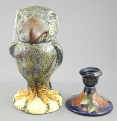 LOT 65 Martin Brothers Style "Bird" Jar (8 3/8"h) & Moorcroft Candlestick. Estimate: $60 - $100 Sold For: $275 Auction Date: Tuesday, January 27 2026 at 4:00 PM