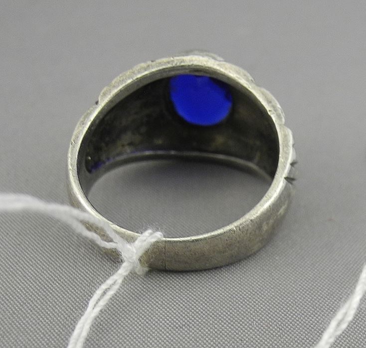 Sterling (marked ster) Silver Ring with Blue Glass Feature, Size 7 3/4, 7.0g.