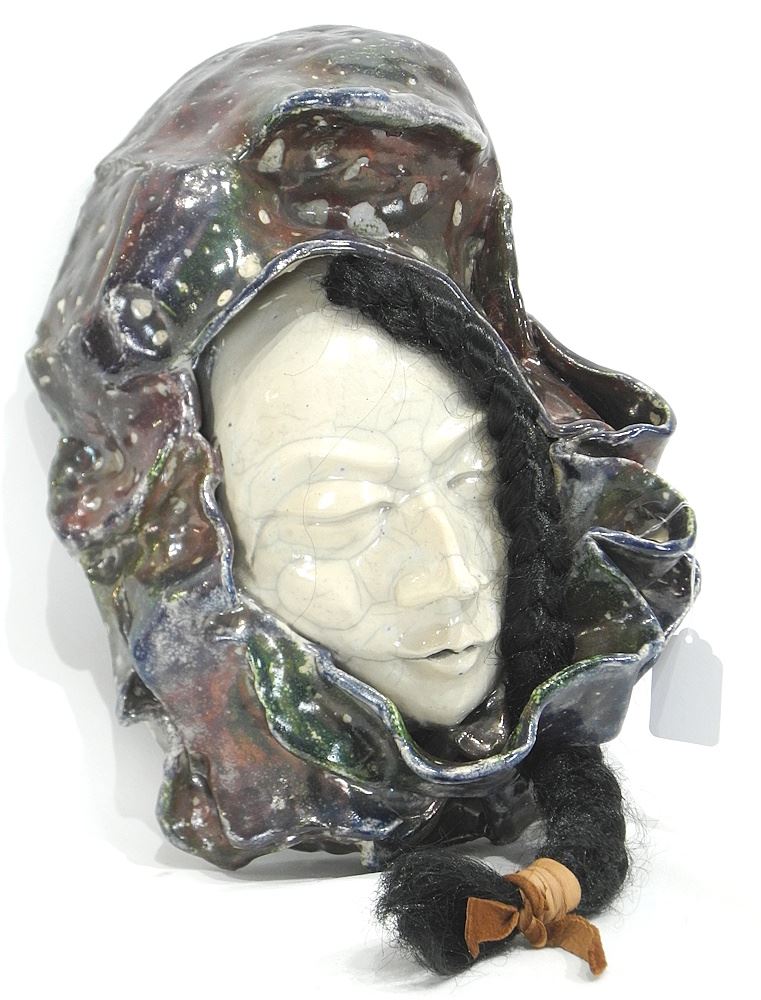 LOT 198 Raku Portrait Mask (13 1/2"h) with Braided Feature. Estimate: $60 - $80 Sold For: $80 Auction Date: Tuesday, January 27 2026 at 4:00 PM