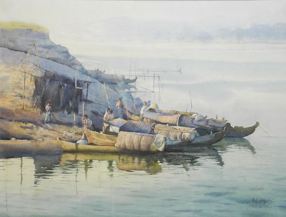 Watercolour signed Indistinctly, 17 x 22 5/8", "Fishing Boats at Waters Edge", 30/10/05.