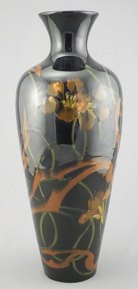 Weller Pottery "Dickens Ware" Vase signed J. Linley, 12 1/2"h (all over deep crazing noted).