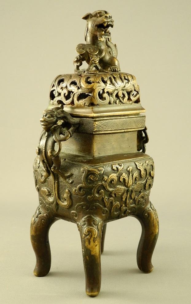 Bronze incense burner with dog of Fo finial on a pierced wooden base, overall height 9 1/4".