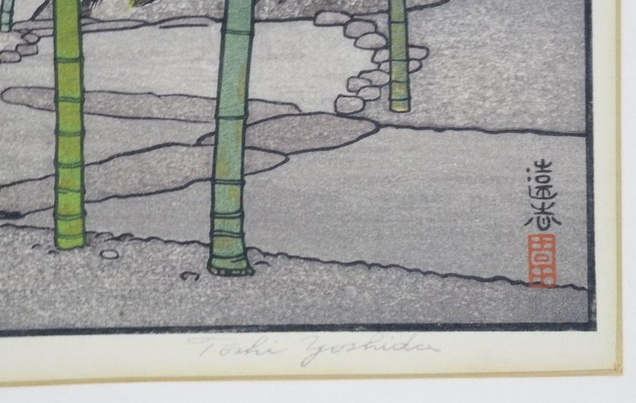 Japanese woodblock print signed Toshi Yoshida, 9" x 14 1/2", "Bamboo Garden".