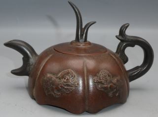 "Dual Lions" Purple Clay Signatured Teapot, Stamps Ch'en Ming-yuan, 14 1/2" x 7".