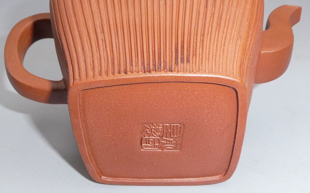 "Sky Curtain" Purple Clay Signed Teapot, Stamped Yu Kuo-liang, 4 1/2" x 6".