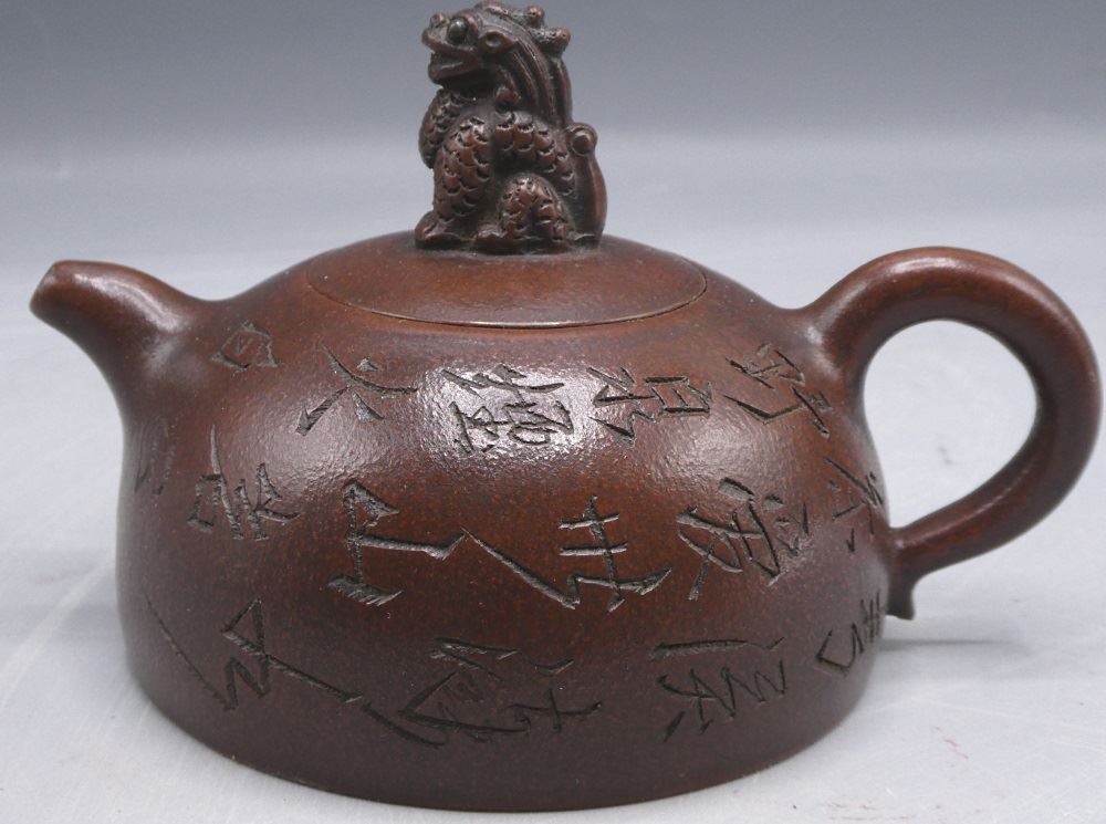 "Poem of Kirin" Half Dome Purple Clay Teapot, 6 1/2" length.