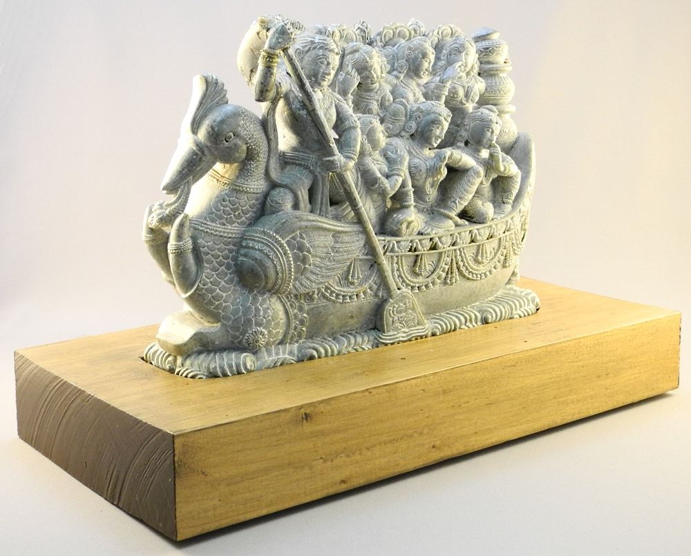 Indian Carved Soft Sstone Sculpture (12"w) of Matsya on Wood Stand, 16"w damaged noted.