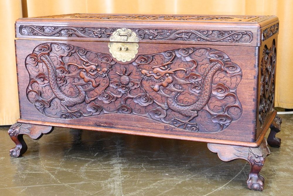 LOT 55 Deep Carved Chinese Camphor Chest, 43" wide, hinges noted. Estimate: $150 - $300 Sold For: $625 Auction Date: Tuesday, June 01 2021 at 6:00 PM