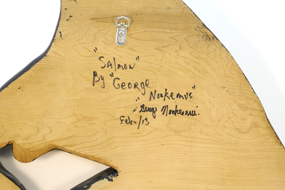 Nuu-Chah-Nulth Cedar "Salmon" Plaque signed George Nookemus, 31" wide.