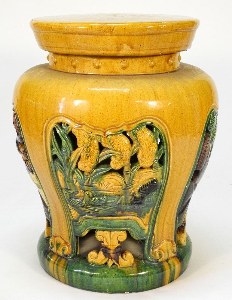 Chinese Sancai Glaze Garden Seat, Chip to foot rim noted, 17" High.
