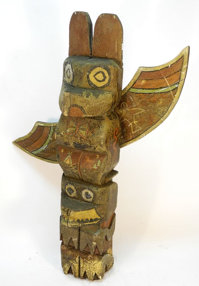 LOT 20A North West Coast Style Model Totem Pole, 36" high. Estimate: $200 - $300 Sold For: $150 Auction Date: Tuesday, June 01 2021 at 6:00 PM