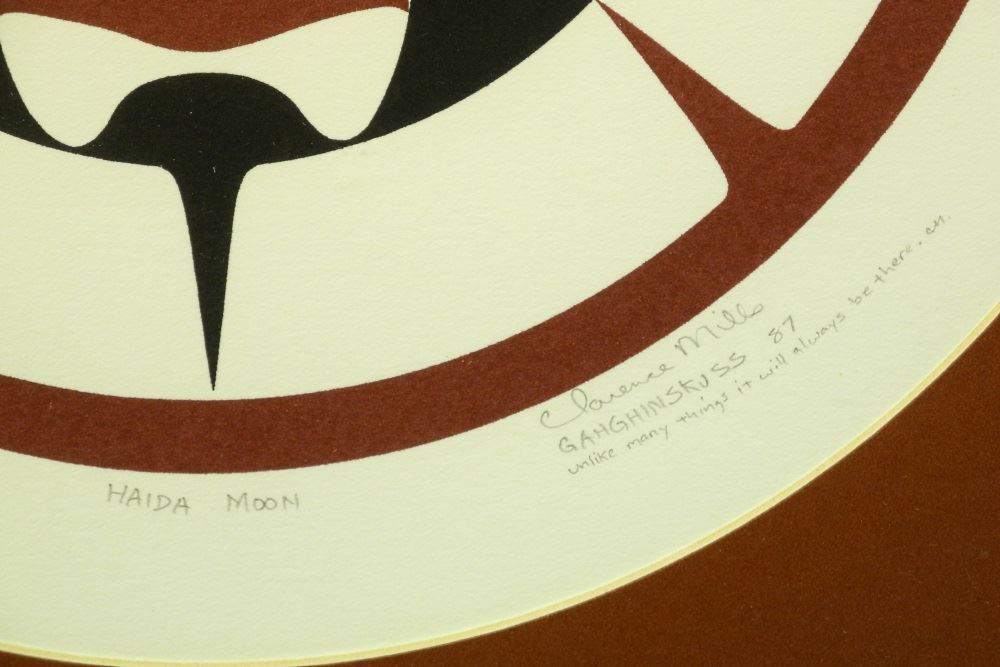 LOT 132 Serigraph "Haida Moon", #122/313, Signed Clarence Mills, 10 3/4"D. Estimate: $70 - $100 Sold For: $60 Auction Date: Tuesday, June 01 2021 at 6:00 PM