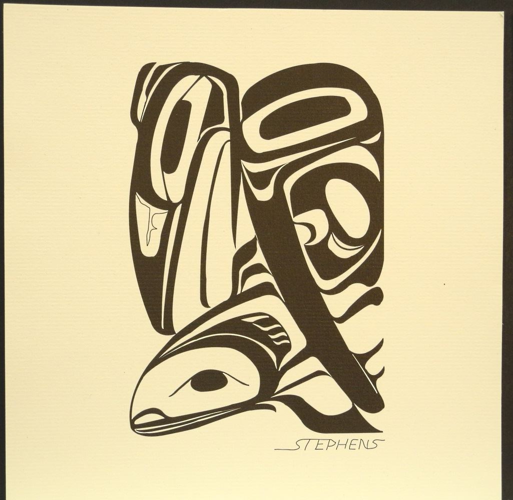 LOT 293 3 Nuu-Chah-Nulth Monochrome Prints Signed Stephens, "8 1/2" x 8 1/2", "Heron & Salmon". Estimate: $60 - $100 Auction Date: Tuesday, June 01 2021 at 6:00 PM