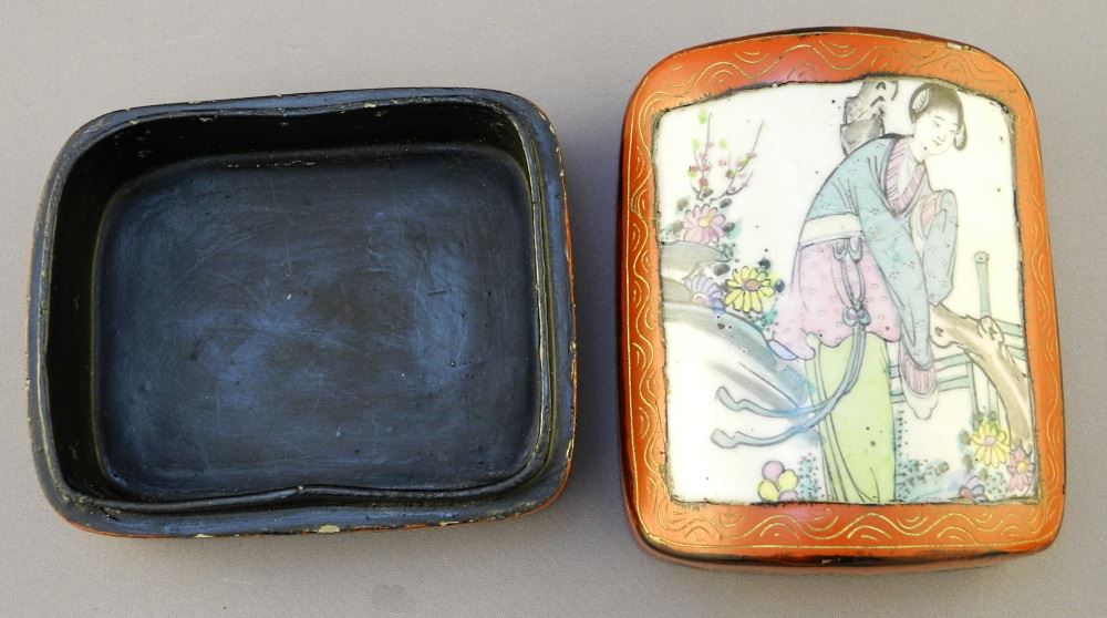 Lacquer Box Inset with Porcelain Shard, 4 1/4" wide.