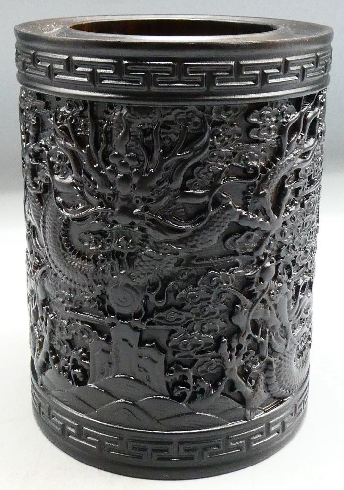 Purple Tan Wood "Heaven Guardians" Brush Pot, 6" high.