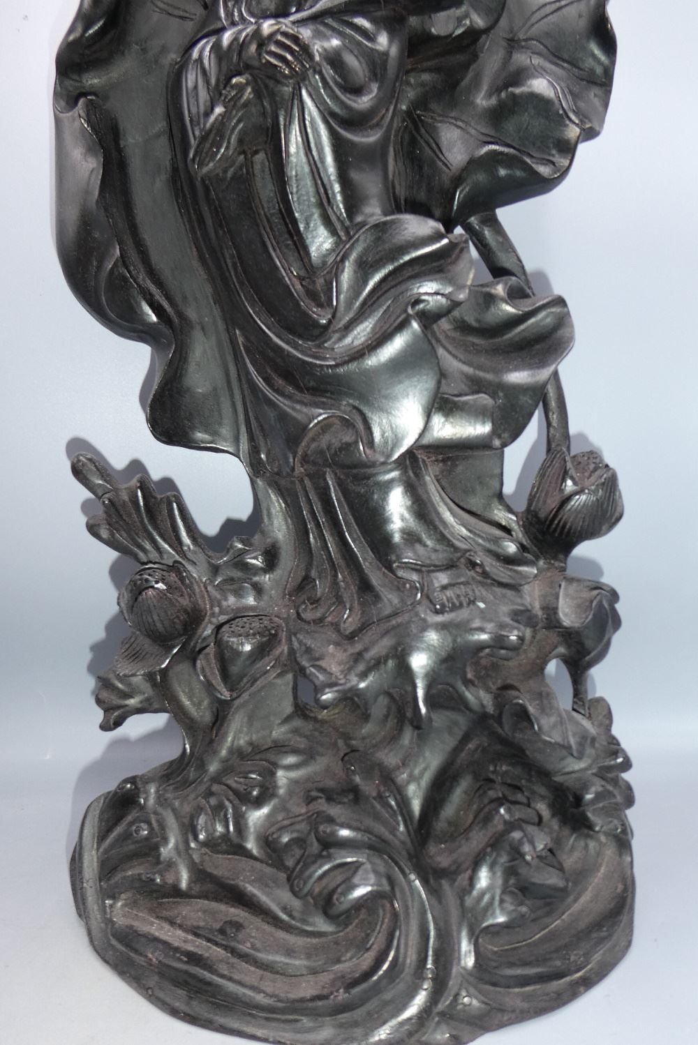 LOT 78 Heavy Purple Tan Wood Statue of Avalokitesvara, 23" high. Estimate: $300 - $400 Sold For: $1,100 Auction Date: Tuesday, August 17 2021 at 6:00 PM