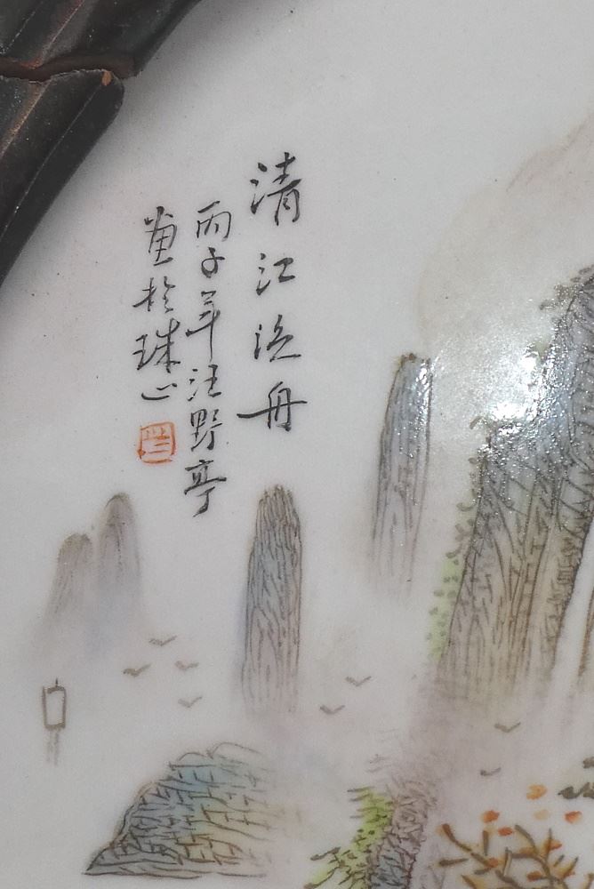 Framed Famille Rose "River Boat" Wall Tiles, signed Wang Yeh-t'ing, 19 1/4" high.