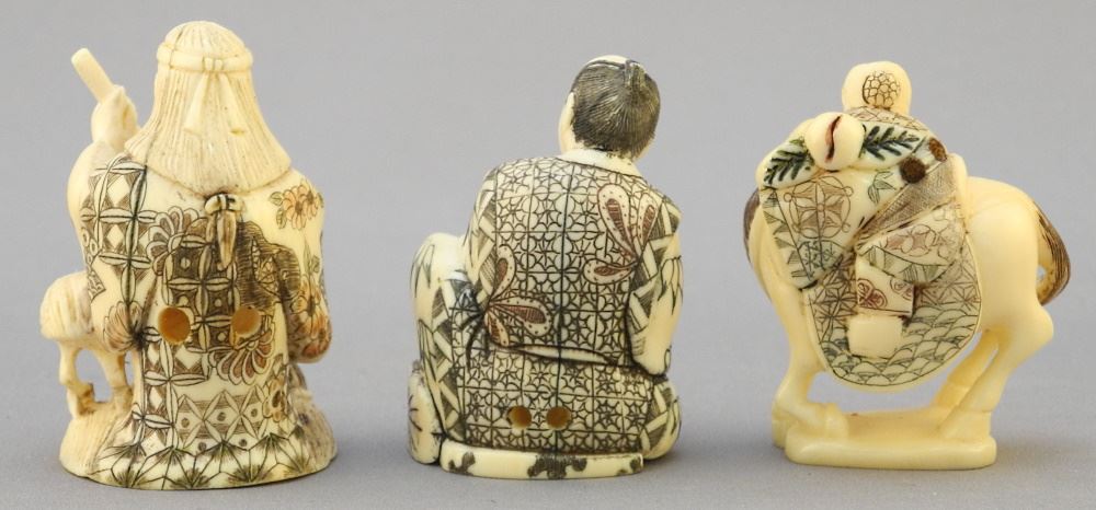 LOT 129 3 Various Japanese Netsuke, Signed, 1 1/4" - 1 7/8" high, no export. Estimate: $150 - $200 Sold For: $150 Auction Date: Tuesday, August 17 2021 at 6:00 PM