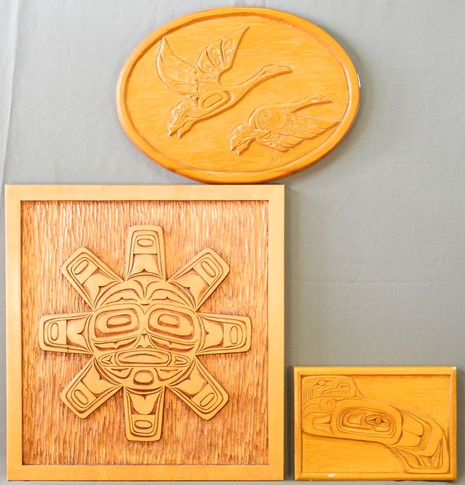 3 Northwest Coast Style Carved Wood Plaques monogrammed DA (2) & AA, 7" - 17 3/4".