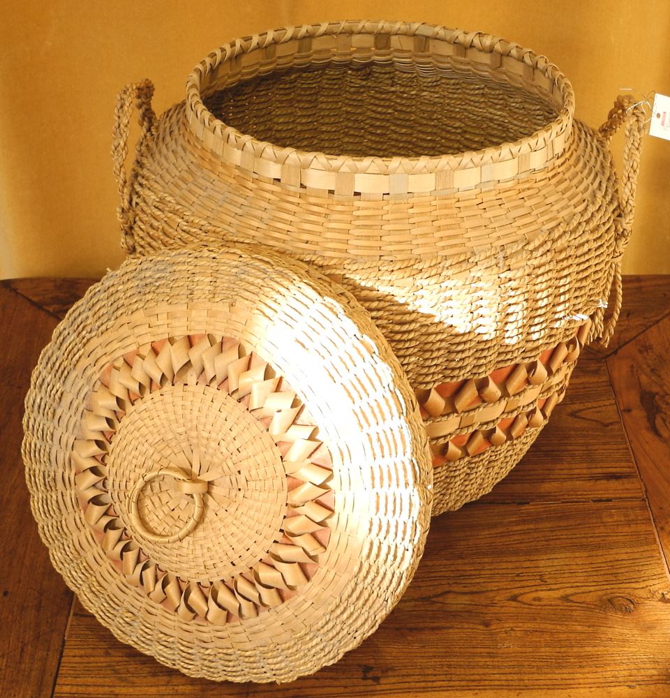 LOT 33 Iroquois Covered Basket, 18" high. Estimate: $80 - $100 Auction Date: Tuesday, October 05 2021 at 6:00 PM