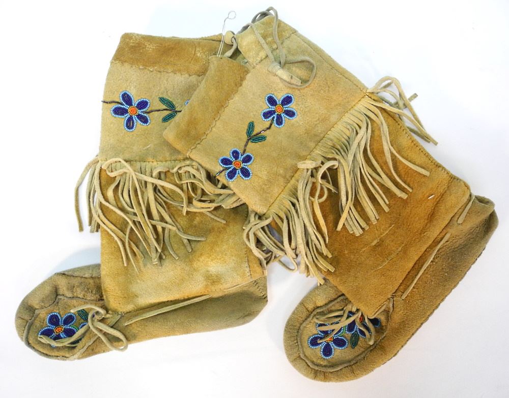 Pair of Tanned Hide Beaded & Fringed Moccasins, 15" high.