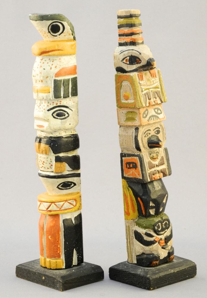 2 Model Totem Poles: 1 signed The Scenery Shop Vancouver, 6 3/4" high.