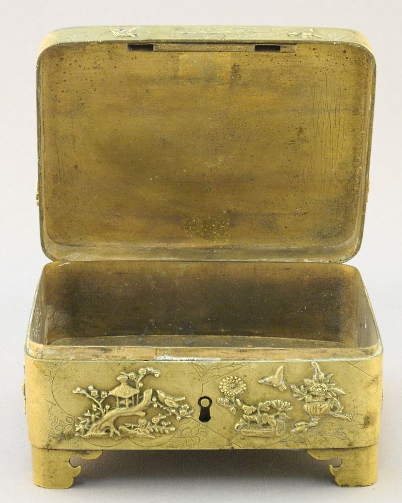 LOT 101 Japanese Embossed Brass Box, no key, 4 3/4" wide. Estimate: $100 - $150 Sold For: $200 Auction Date: Tuesday, November 30 2021 at 6:00 PM