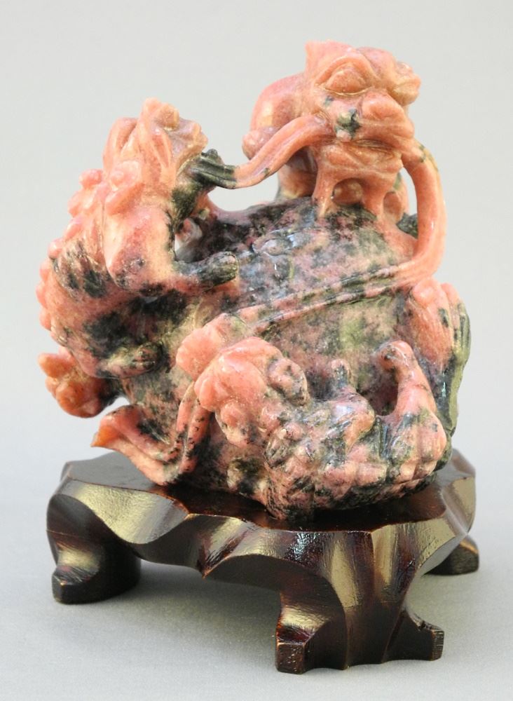 Rhodonite Sculpture "Fo Dogs on Ball", 3 3/4" x 3 1/2" x 3 1/2", with Stand.