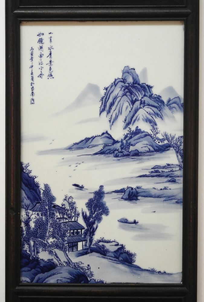 2 Chinese Blue & White Framed Porcelain Plaques, 33 1/2" x 12 1/4"