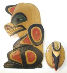 Squamish Bear Plaque Signed Darcy Dan Joseph (14 14/"H) & a Raven Carving on Stand, 6 1/4".