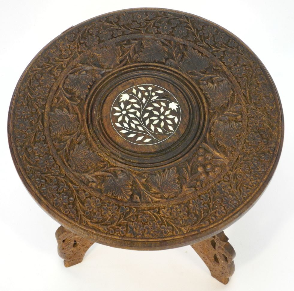 LOT 233 Indian Bone Inlaid & Ship Carved Side Table, 2 Sections. Estimate: $50 - $60 Sold For: $20 Auction Date: Tuesday, April 05 2022 at 6:00 PM