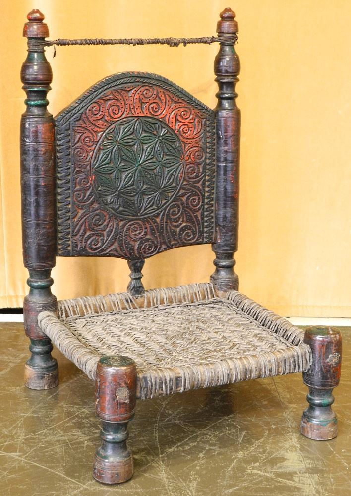 Afghani Low Chair, Carved Wood with Woven Fiber Seat, 29 1/2" high.