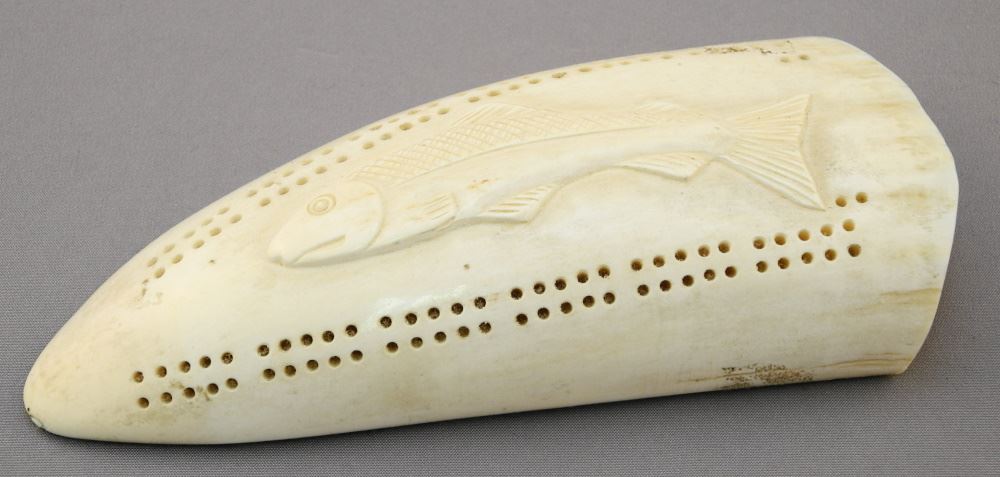 Whale Tooth Fish Design Cribbage Board, 5 1/8" Length, No Export.