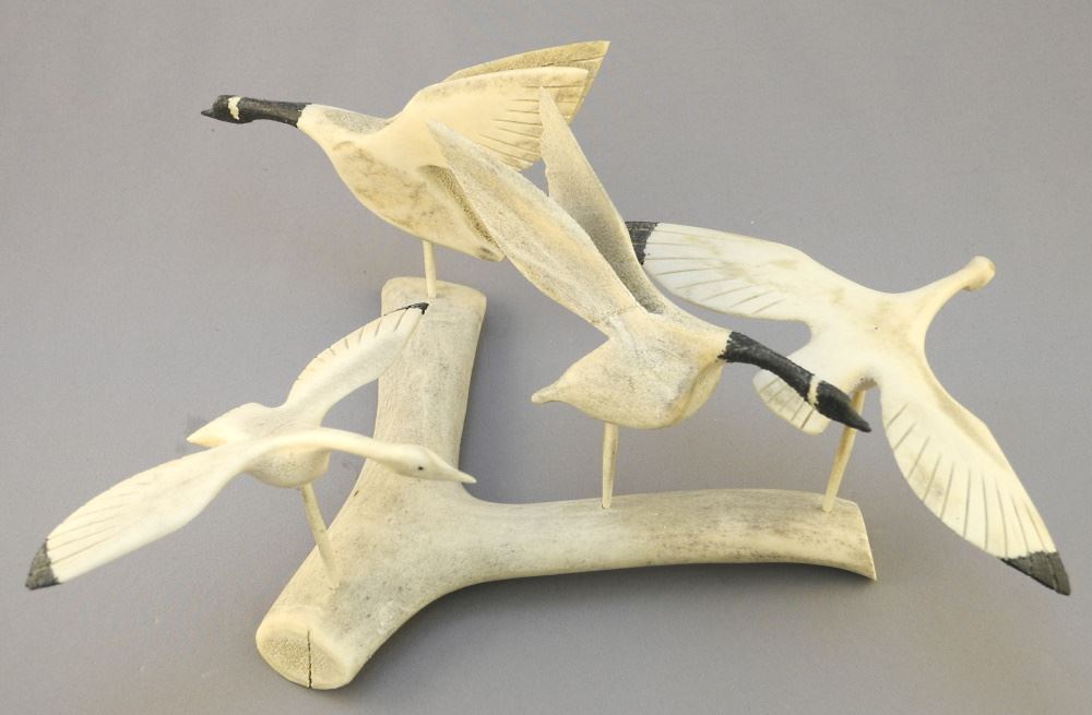 LOT 112 Inuit Antler Carving Signed Jacob Irkok, 8" x 6" Variable, "Canada Geese", Wing Restored. Estimate: $200 - $300 Sold For: $200 Auction Date: Tuesday, April 05 2022 at 6:00 PM