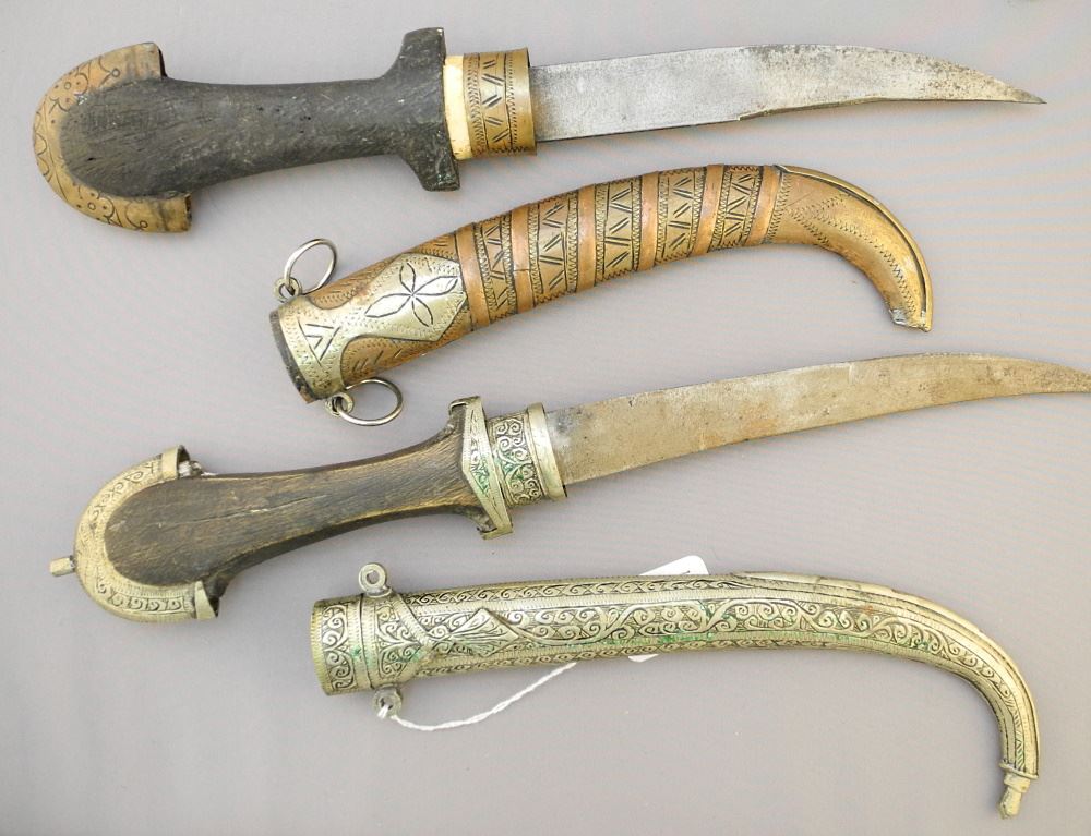 LOT 267 4 Knives in Metal Work Sheathes with Wooden Handles, Approx. 14 1/2" - 15 1/2" Length. Estimate: $100 - $200 Sold For: $220 Auction Date: Tuesday, April 05 2022 at 6:00 PM