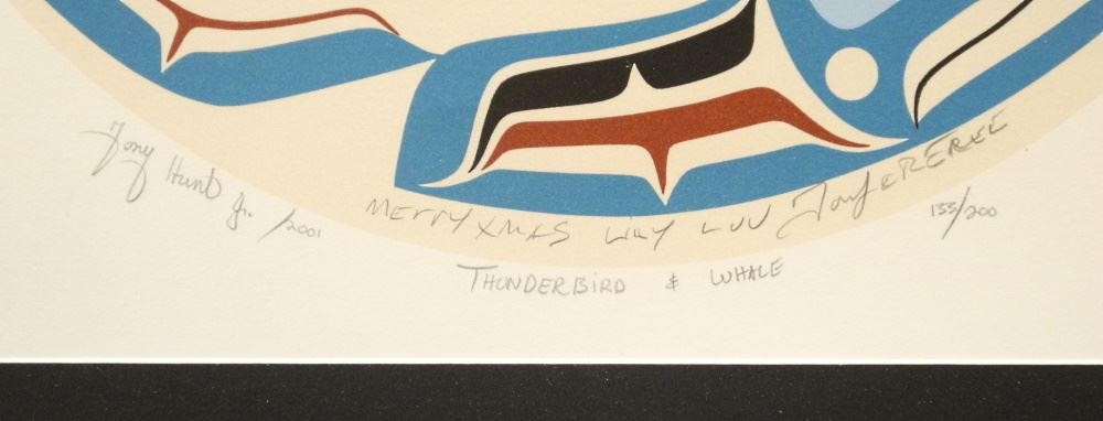 LOT 180 Kwagiulth Serigraph Signed Tony Hunt Jr 2001, 15" x 15", "Thunderbird & Whale", #133/200. Estimate: $80 - $100 Sold For: $240 Auction Date: Tuesday, April 05 2022 at 6:00 PM