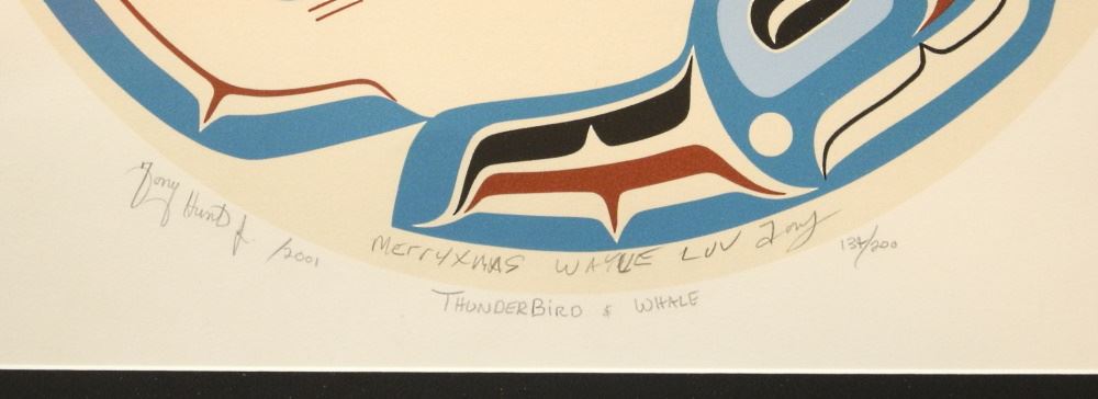 LOT 181 Kwagiulth Serigraph Signed Tony Hunt Jr 2001, 15" x 15", "Thunderbird & Whale", #134/200. Estimate: $80 - $100 Sold For: $260 Auction Date: Tuesday, April 05 2022 at 6:00 PM