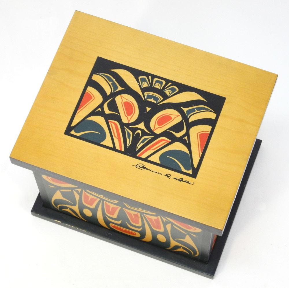 LOT 325 Decorative Northwest Coast Box, Cover Signed Clarence Wells, 8" x 9 1/2" x 7 1/2". Estimate: $50 - $60 Sold For: $120 Auction Date: Tuesday, April 05 2022 at 6:00 PM