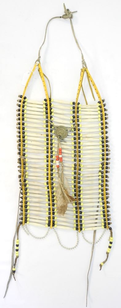 LOT 70 Faux Dentalium Breast Plate with Medallion, "Wanuskewin Heritage Park Saskatoon '92", 19". Estimate: $50 - $60 Sold For: $40 Auction Date: Tuesday, April 05 2022 at 6:00 PM