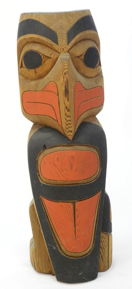 LOT 395 Coast Salish Model Owl Pole Signed Detreck George 2001, 25 7/8"H. Estimate: $200 - $300 Sold For: $150 Auction Date: Tuesday, April 05 2022 at 6:00 PM