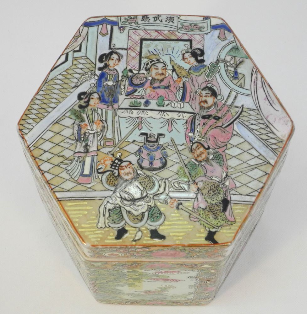Hexagonal Chinese Famille Rose Porcelain Covered Jar, 10 1/4"H.