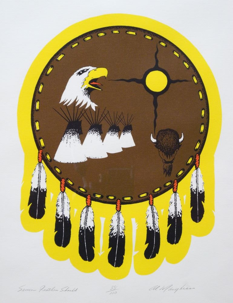 LOT 87 Sioux Serigraph Signed Al (Aloysius) Manybears, 21" x 13 7/8", "Seven Feather Shield", #38/100. Estimate: $100 - $200 Auction Date: Tuesday, April 05 2022 at 6:00 PM