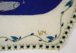LOT 347 Inuit Felt Embroidery Panel Monogrammed VM, 16" x 3 3/4", "Char Fishing". Estimate: $80 - $100 Sold For: $280 Auction Date: Tuesday, April 05 2022 at 6:00 PM