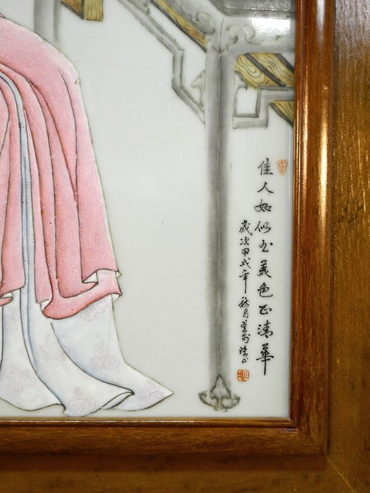 LOT 348 Chinese Famille Rose Plaque of a Seated Maiden & Antiques, Plaque 21 1/4" x 12 3/8". Estimate: $200 - $400 Sold For: $800 Auction Date: Tuesday, June 21 2022 at 6:00 PM